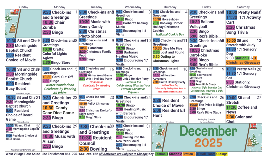 West Village Post Acute is proud to offer a robust Activities Program. Our residents enjoy weekly outings with activities. Please view our activity calendar below.